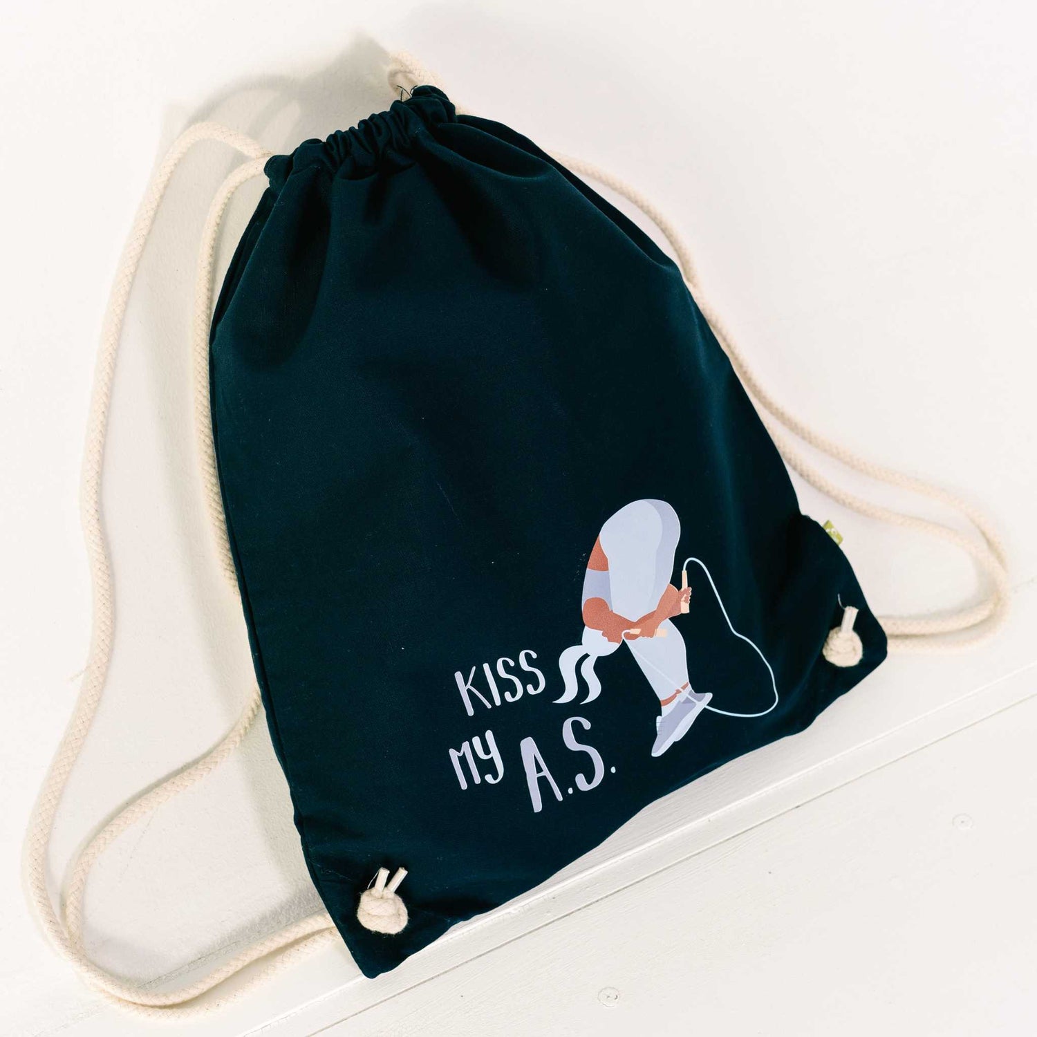 This durable drawstring bag by Westford Mills is made from 100% organic cotton and is GOTS certified, ensuring it meets the highest environmental and social standards. In navy blue with the playful "Kiss my A.S." print, it adds a fun twist to your workout gear. The "A.S." refers to a jump where the rope is crossed behind the knees, as shown in the image.