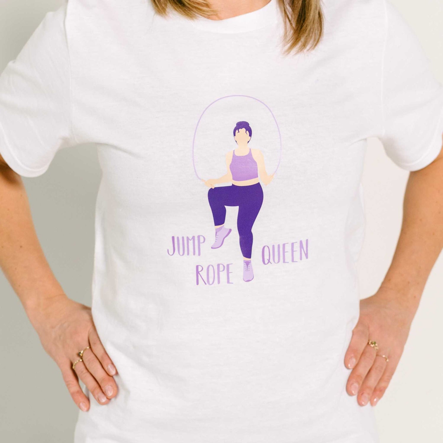 Introducing the "Jump Rope Queen" T-shirt, crafted from 100% pure organic cotton and designed for comfort and style. This high-quality T-shirt is made by Russell, adhering to the strictest environmental, social, and ecological standards. The fabric is biodegradable and sourced sustainably, ensuring it’s both eco-friendly and soft to the touch.